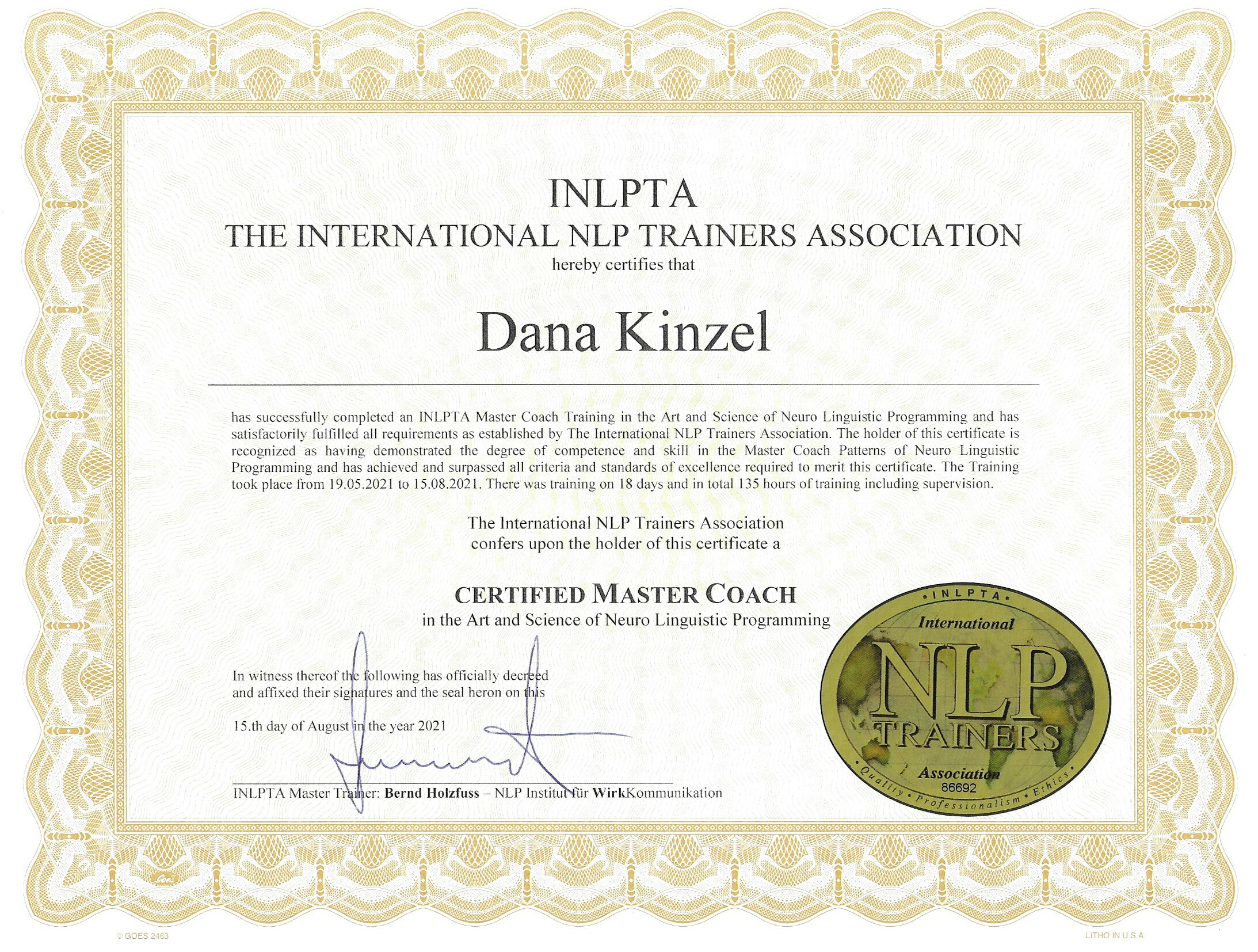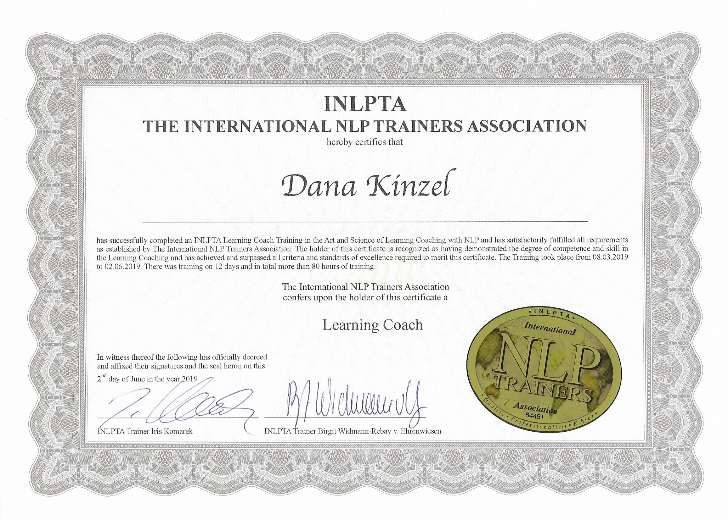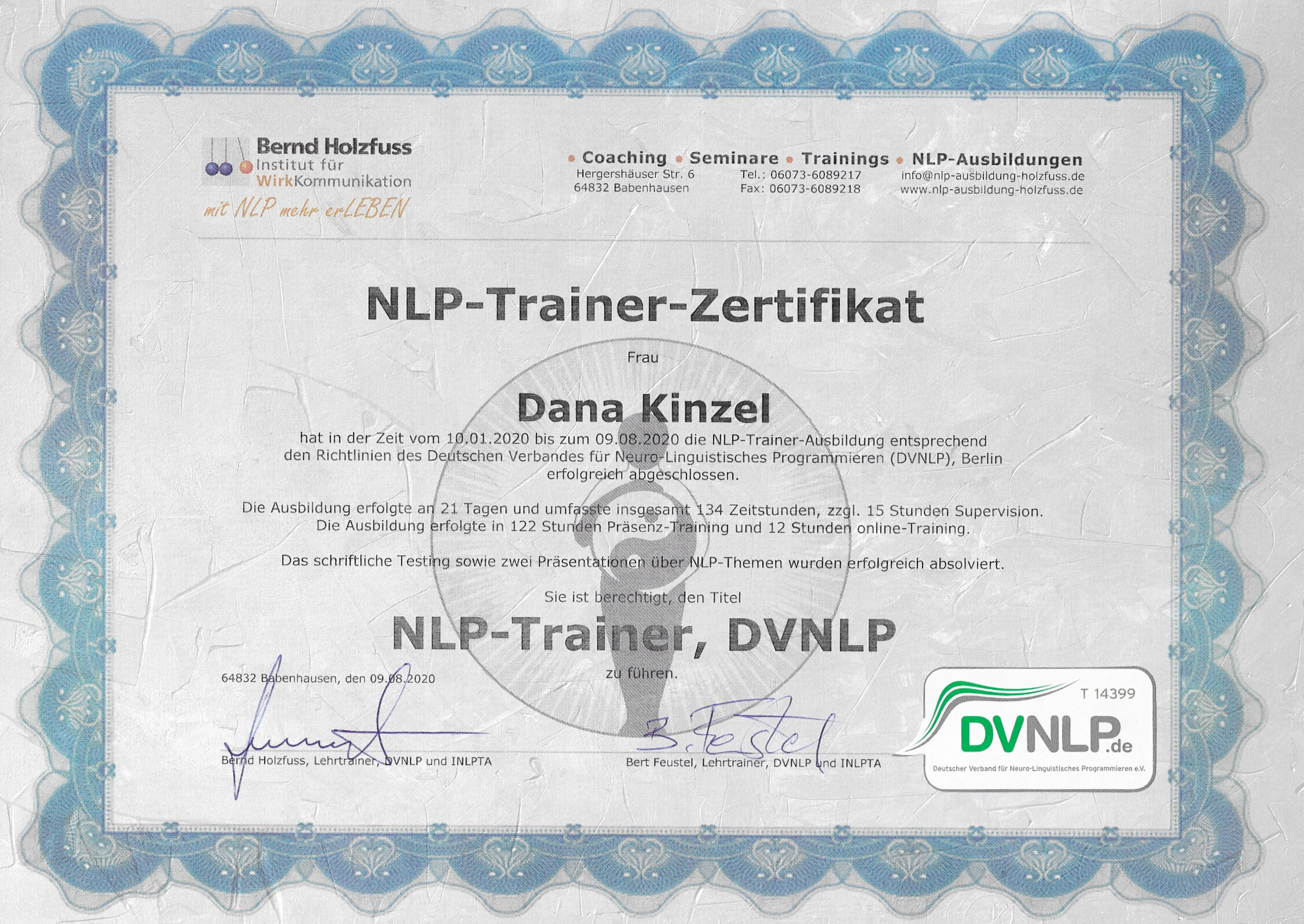 - 5-jährige berufsbegleitende Ausbildung zum zertifizierten NLP Master Coach nach INLPTA und zur NLP Trainerin nach INLPTA und DVNLP (2017 – 2021)